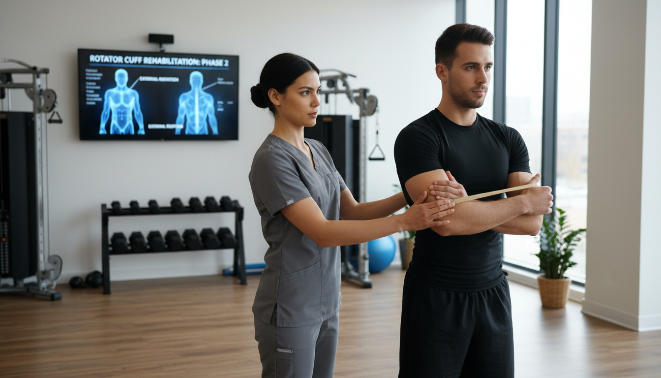 Specifika stärkande övningar för rotatorcuffen, ofta i form av utåtrotation med flexibla band. - Hur hittar jag balans mellan vila och träning vid impingement axel?