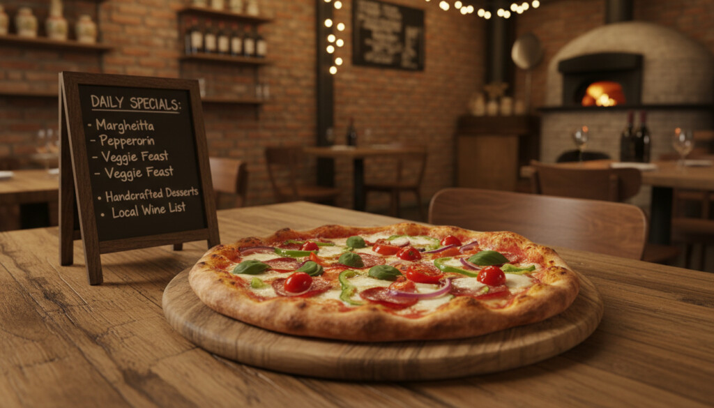 - Menyn omfattar klassiska pizzor (Margherita, Vesuvio, Capricciosa), trendiga varianter, barnpizzor, veganska alternativ och dessertpizza.